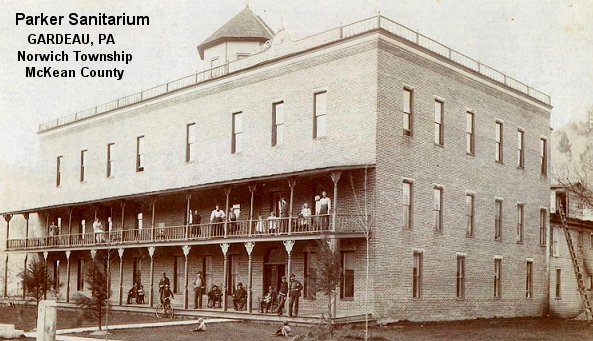 Did you know there once was a famous health spa in Gardeau? Well, it existed and was called the Parker Mineral Sanitarium. Shortly after 1865, Colonel Noah Parker built the first hotel, which later burned down. In 1888, he built a second hotel, a large three story brick building with bathhouse and bottling works. This new hotel was again destroyed by fire in 1898. Hardly any sign remains of this once prestigious establishment. The following text is taken from an old pamphlet that once was in circulation.